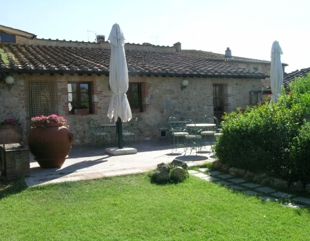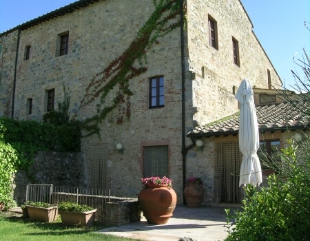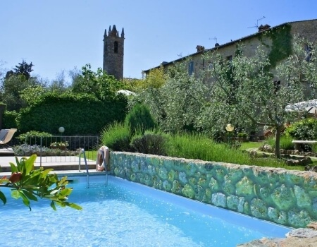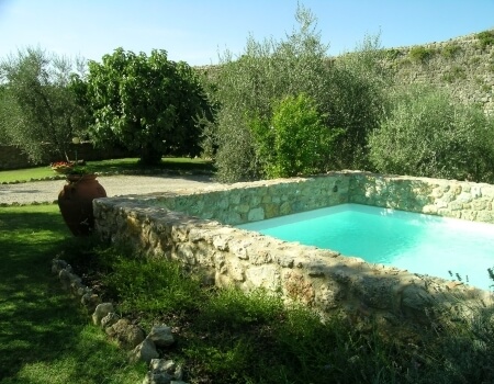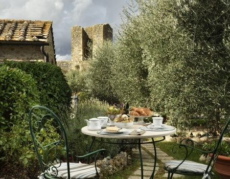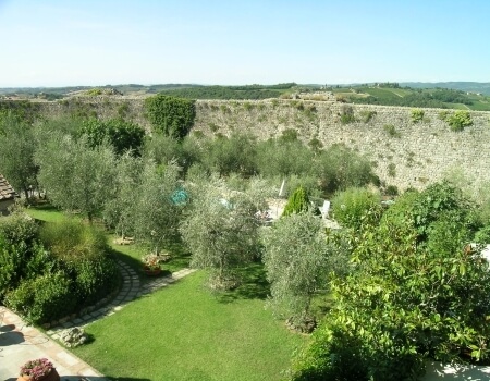 The ancient city walls surrounding the medieval village separate the garden from the gentle hills that overlook the countryside towards Siena and Florence.
